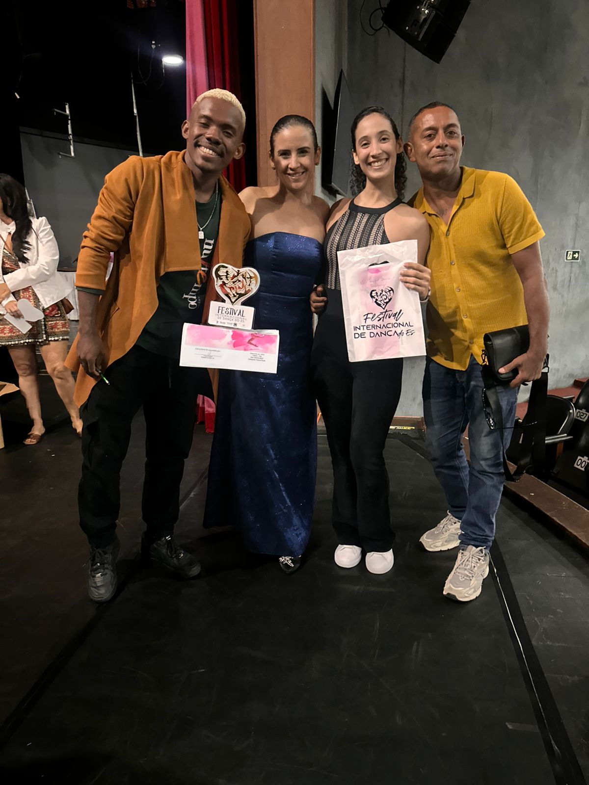 Na foto, Everaldo Pereira, os bailarinos vencedores Lucas Santos e Carol Rios, e Liviane Pimenta, diretora da Escola Pimenta Dance e organizadora do Festival Internacional de Dança do Espírito Santo (foto: divulgação)