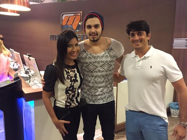 Em excelente forrma física, o cantor treinou com seu personal trainer na Academia Movimento Fitness. Na foto, com o casal proprietário Marcelle Pontes e Edclei Lima.