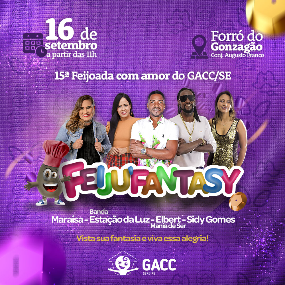 E para comemorar a 15ª edição da Feijoada com Amor do GACC/SE, a programação vem recheada da culinária de dar “água na boca”, diversão e boa música com as seguintes atrações: Banda Estação da Luz, Maraísa, Sidy Gomes e o verdadeiro samba de roda com o cantor Elbert do Grupo Mania de Ser.