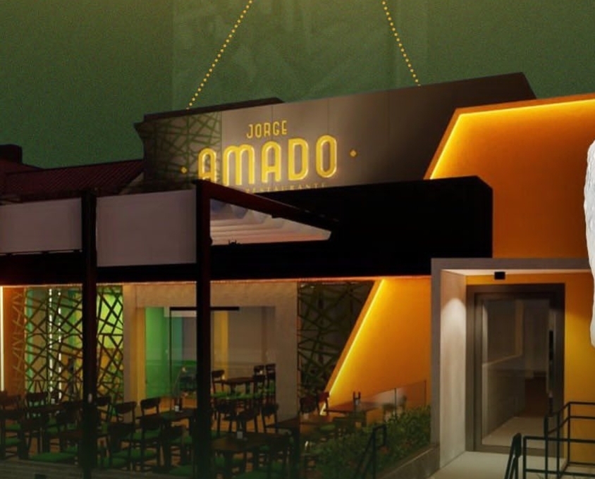 Uma obra bonita e de muito bom gosto me chamou a atenção durante as andanças com o romeu e magali, meus buldogs ingleses. A curiosidade foi resolvida com a montagem da placa no alto do pé direito do espaço: trata-se do Bar e Restaurante Jorge Amado, localizado na avenida de nome homônimo, no Garcia