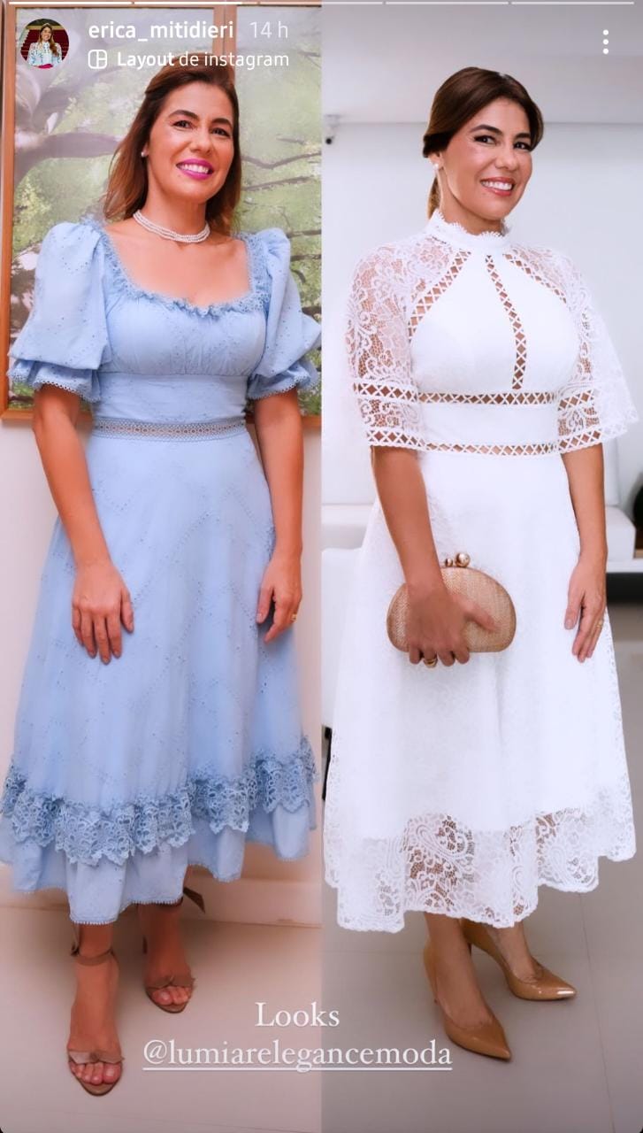 Nas solenidades, um culto evangélico na Praça Fausto Cardoso (véspera de Ano Novo), e a posse do maridón, Érica usou vestidos que eram puro romance, com detalhes de rendas, acinturados e mangas destacadas. Ambos eram da Lumiar Elegance, uma grife carioca.