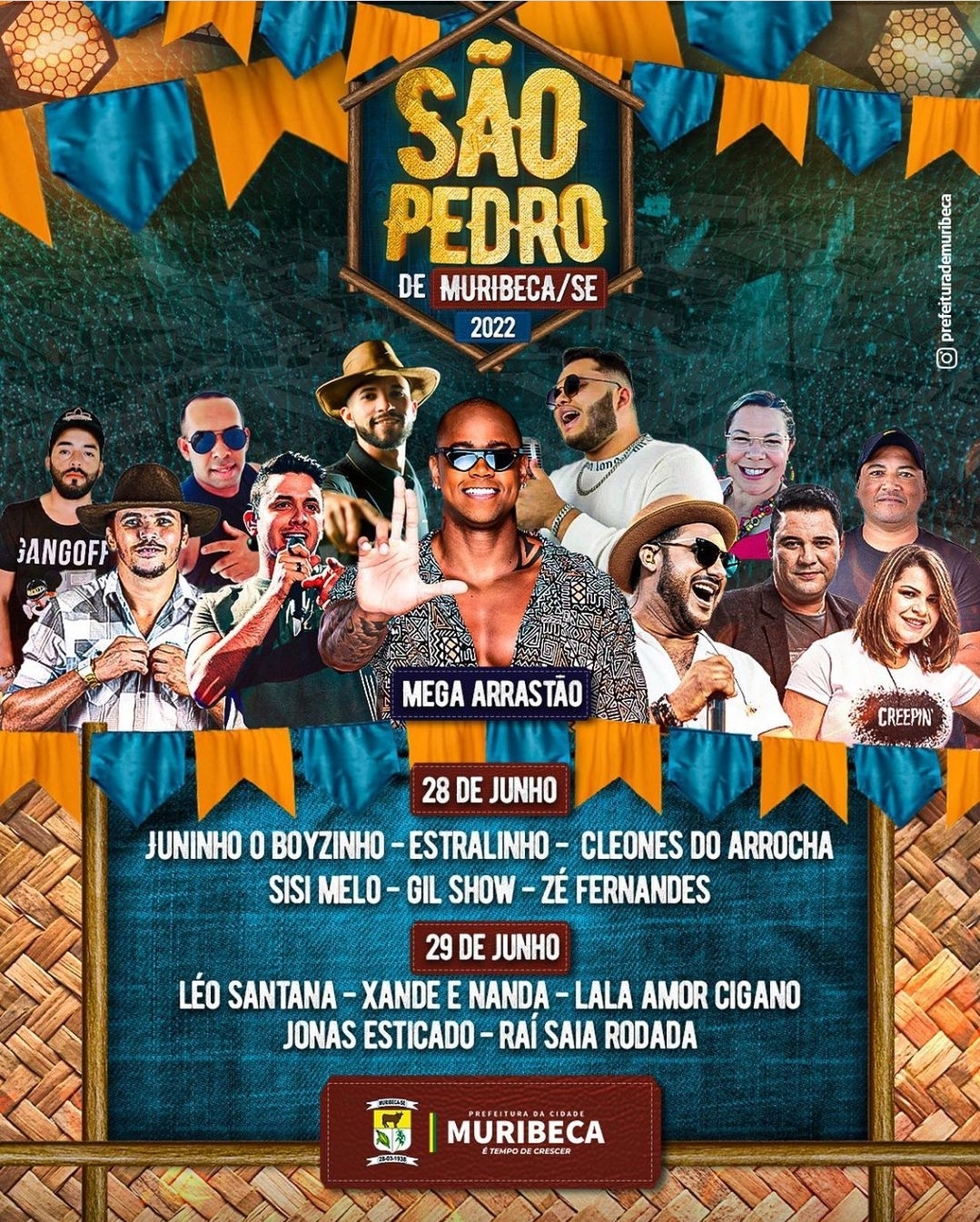 Na terça-feira, 28, a partir das 21 horas, na Arena de Eventos, o show é comandado pelos artistas muriqueneses: Juninho (o boyzinho), Estralinho, Cleones do Arrocha, Sisi Melo, Gil Show e Zé Fernandes.