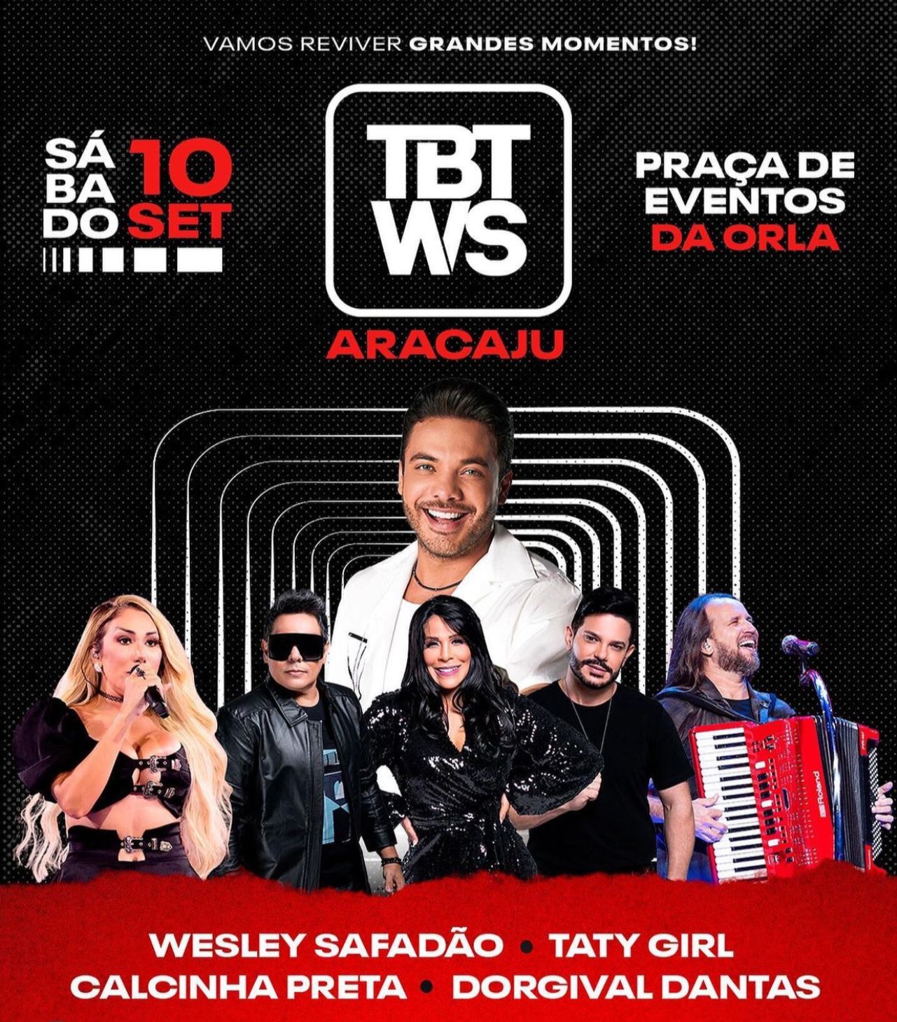 Tem novo show na cidade! Na Praça de Eventos da Orla, dia 10 de setembro, a partir das 21 horas, rola o #TBT WS para relembrar os sucessos da carreira de Wesley Safadão. Ainda na noite, se apresentam a banda Calcinha Preta, Dorgival Dantas e Taty Girl.