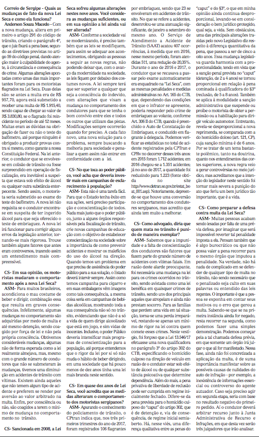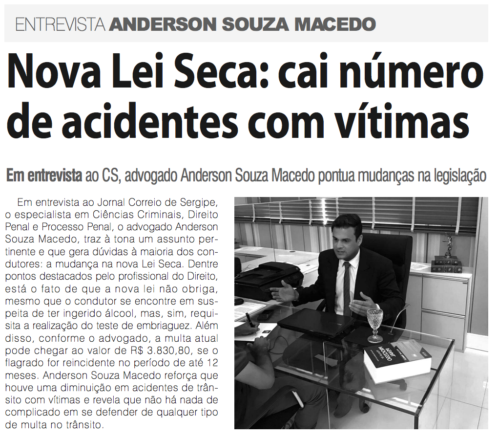 Uma entrevista sobre a nova Lei Seca foi veiculada recentemente no Correio de Sergipe com o advogado criminalista Anderson Macedo. Especialista em Ciências Criminais, Direito Penal e Processo Penal, os destacados pelo profissional do Direito, esclareceu sobre algumas mudanças. Veja na íntegra por aqui.
