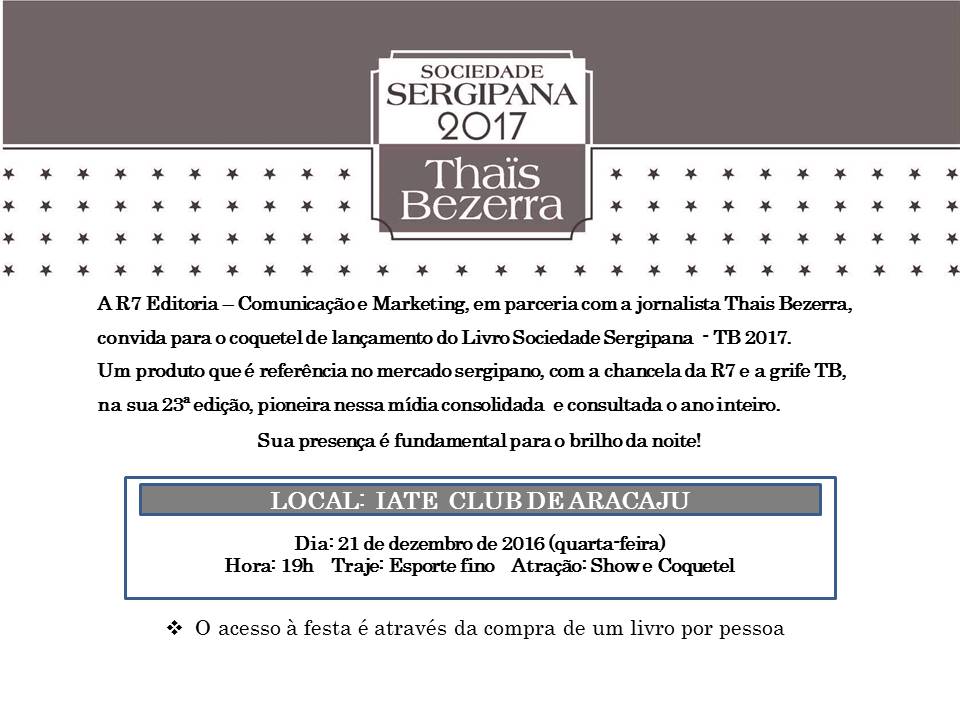 São 23 anos de trabalho, uma parceria de sucesso com a R7. É a própria famosa jornalista que nos convida - sim, TB não tem estrelismo e arregaça as mangas quando o assunto é trabalho -, para o lançamento da Edição 2017, dia 21 de dezembro, quarta agora, no Iate Club de Aracaju, às 19 horas.