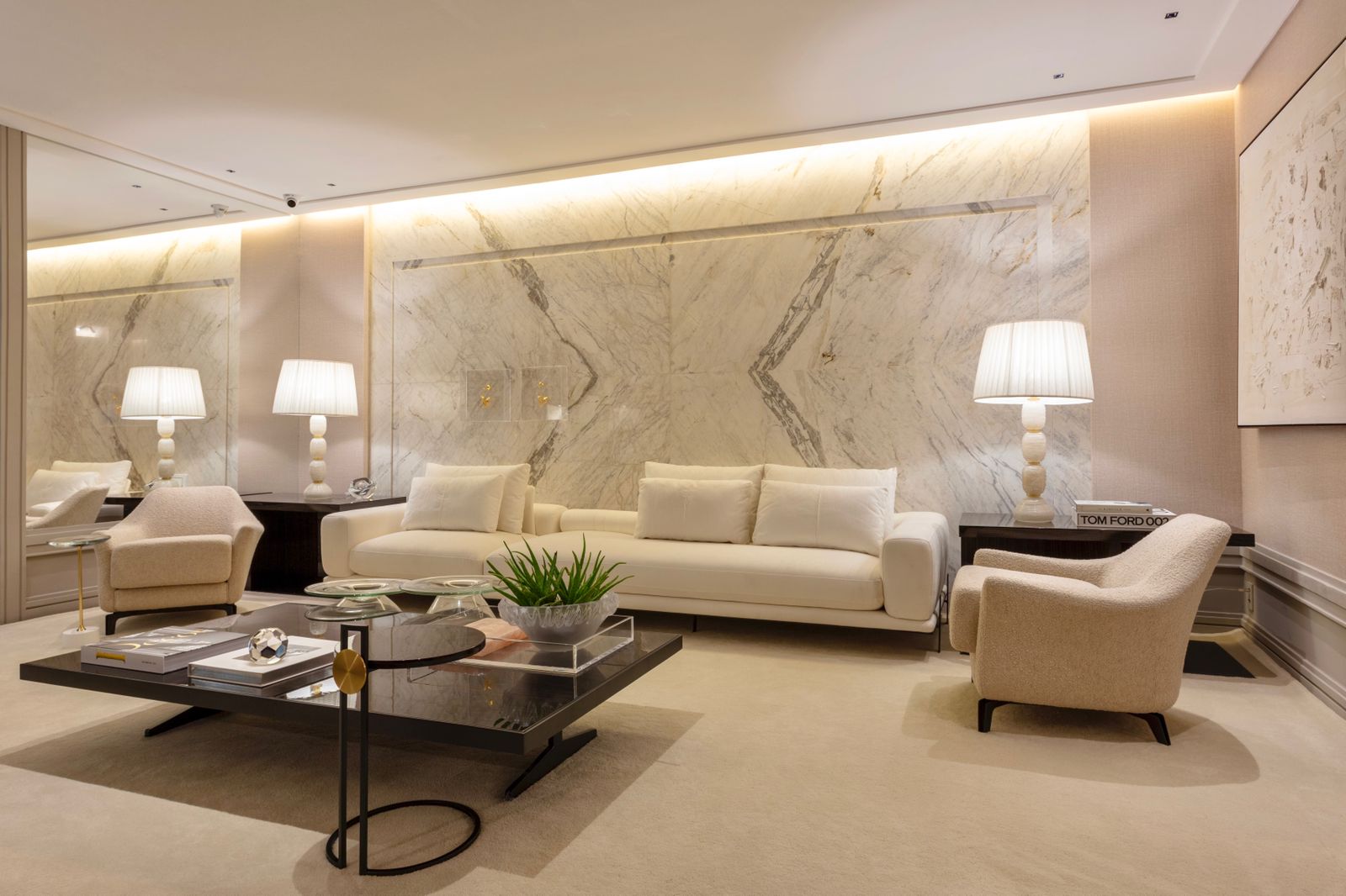 O mobiliário, grifado pela Celi Mall Flagship, foi selecionado pela atemporalidade. Resgates como a poltrona Navona do mestre Sérgio Rodrigues, criada em 1960, traz a história do design brasileiro de vanguarda ao rico projeto.