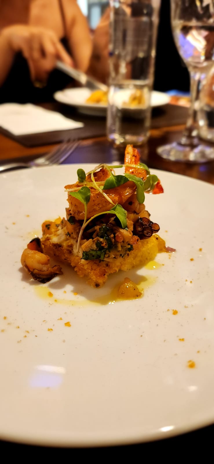 Grelhado do mar: polvo, camarão e mexilhão com tomate confit e um sutil creme de queijo