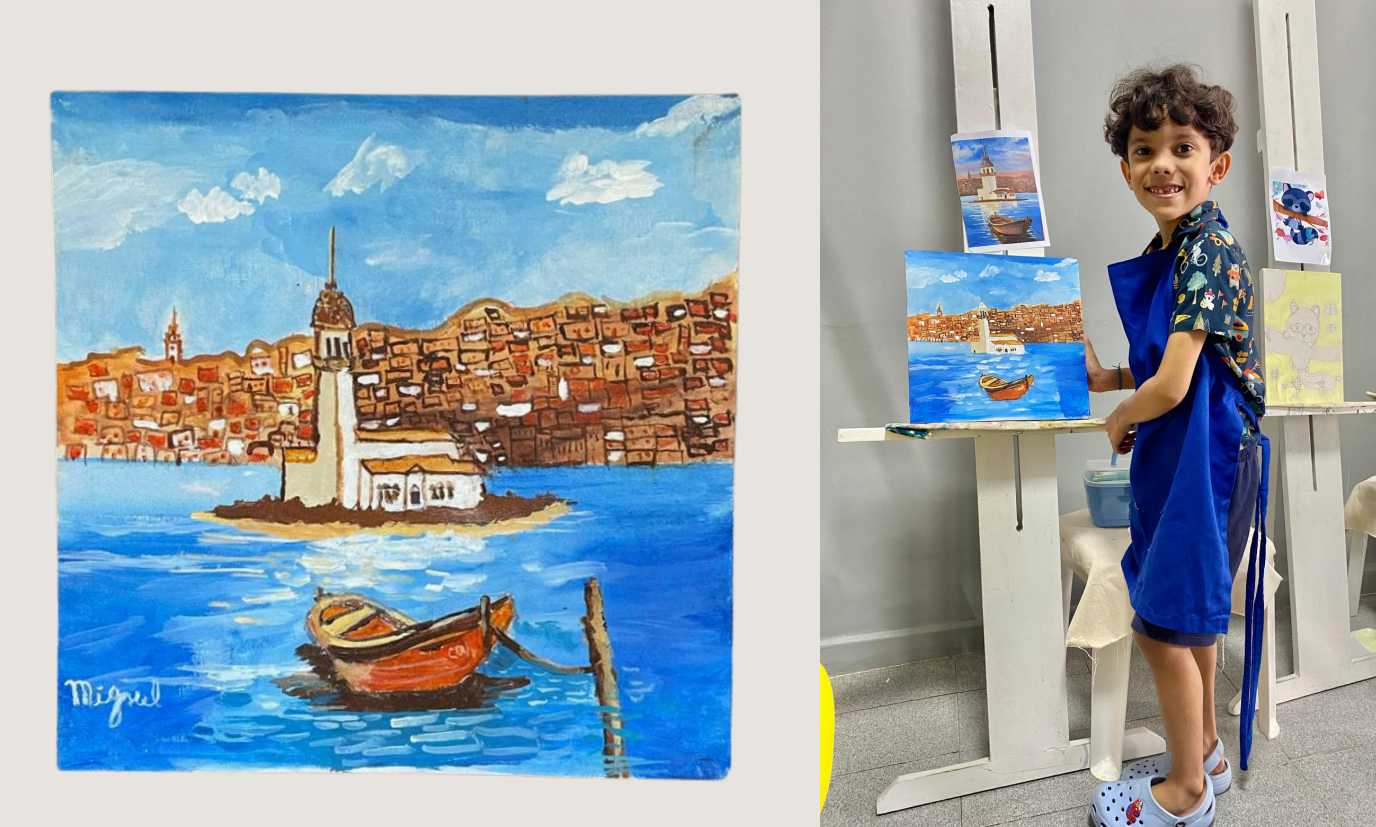 O destaque da noite foi o jovem artista Miguel Lobo, de apenas nove anos, que encantou o público com obras vibrantes e cheias de imaginação. Suas pinturas revelam uma genialidade sensível e uma maturidade artística que inspiram, mostrando como a arte infantil pode ser um espelho poderoso do mundo.
